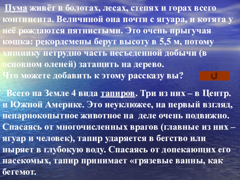 Пума живёт в болотах, лесах, степях и горах всего континента. Величиной она почти с ягуара, и котята у неё рождаются пятнистыми. Это очень прыгучая кошка: рекордсмены берут высоту в 5,5 м, потому хищнику нетрудно часть несъеденной добычи (в основном оленей) затащить на дерево. Что можете добавить к этому рассказу вы?