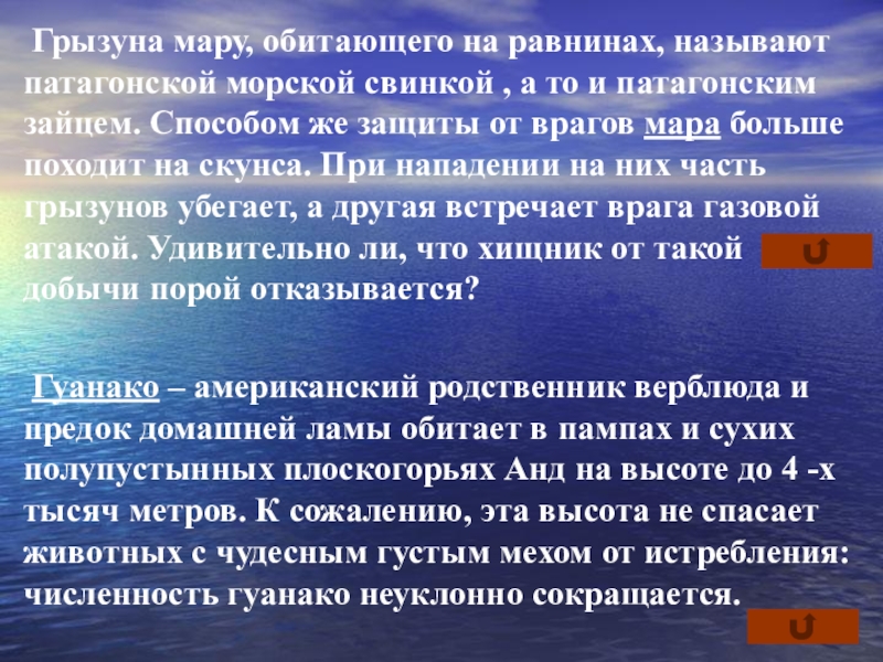Гуанако – американский родственник верблюда и предок домашней ламы обитает в пампах и сухих полупустынных плоскогорьях Анд на высоте до 4 -х тысяч метров. К сожалению, эта высота не спасает животных с чудесным густым мехом от истребления: численность гуанако неуклонно сокращается.