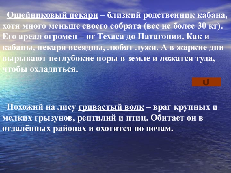 Ошейниковый пекари – близкий родственник кабана, хотя много меньше своего собрата (вес не более 30 кг). Его ареал огромен – от Техаса до Патагонии. Как и кабаны, пекари всеядны, любят лужи. А в жаркие дни вырывают неглубокие норы в земле и ложатся туда, чтобы охладиться.