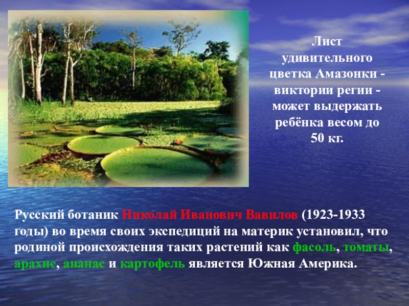 Русский ботаник Николай Иванович Вавилов (1923-1933 годы) во время своих экспедиций на материк установил, что родиной происхождения таких растений как фасоль, томаты, арахис, ананас и картофель является Южная Америка.