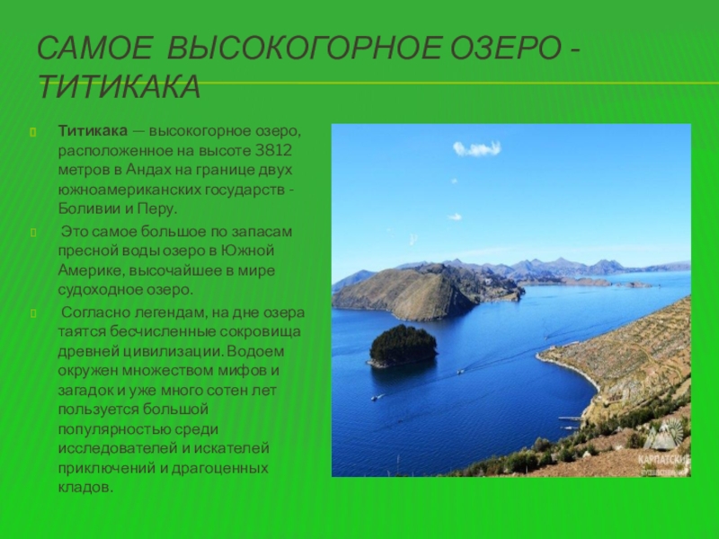 Это самое большое по запасам пресной воды озеро в Южной Америке, высочайшее в мире судоходное озеро.