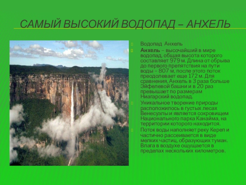 общая высота которого составляет 979 м. Длина от обрыва до первого препятствия на пути воды – 807 м, после этого поток преодолевает еще 172 м. Для сравнения, Анхель в 3 раза больше Эйфелевой башни и в 20 раз превышает по размерам Ниагарский водопад.