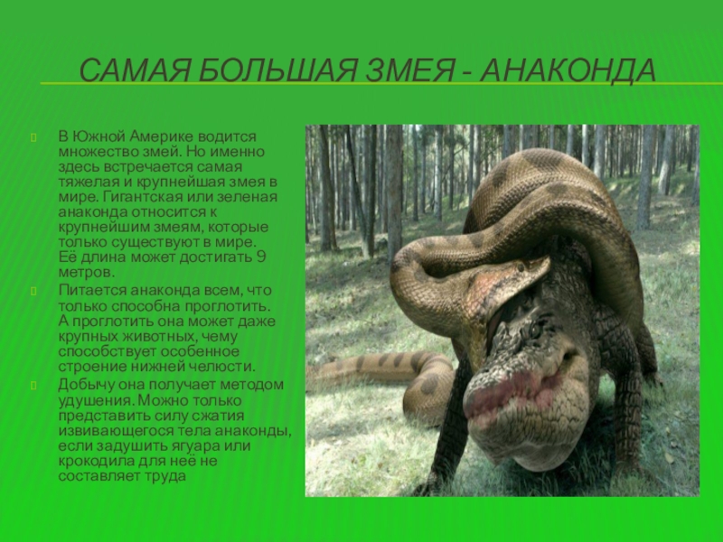 Добычу она получает методом удушения. Можно только представить силу сжатия извивающегося тела анаконды, если задушить ягуара или крокодила для неё не составляет труда