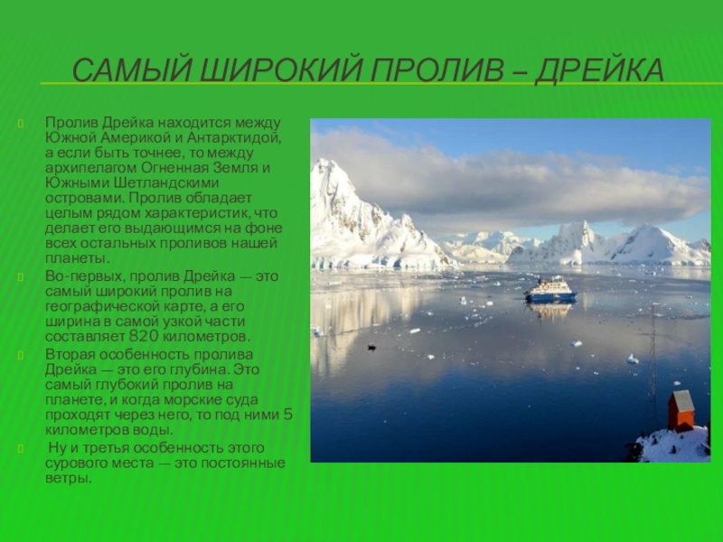 Во-первых, пролив Дрейка — это самый широкий пролив на географической карте, а его ширина в самой узкой части составляет 820 километров.