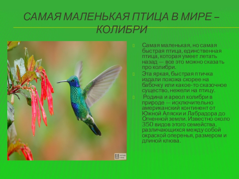 птица, единственная птица, которая умеет летать назад — все это можно сказать про колибри.