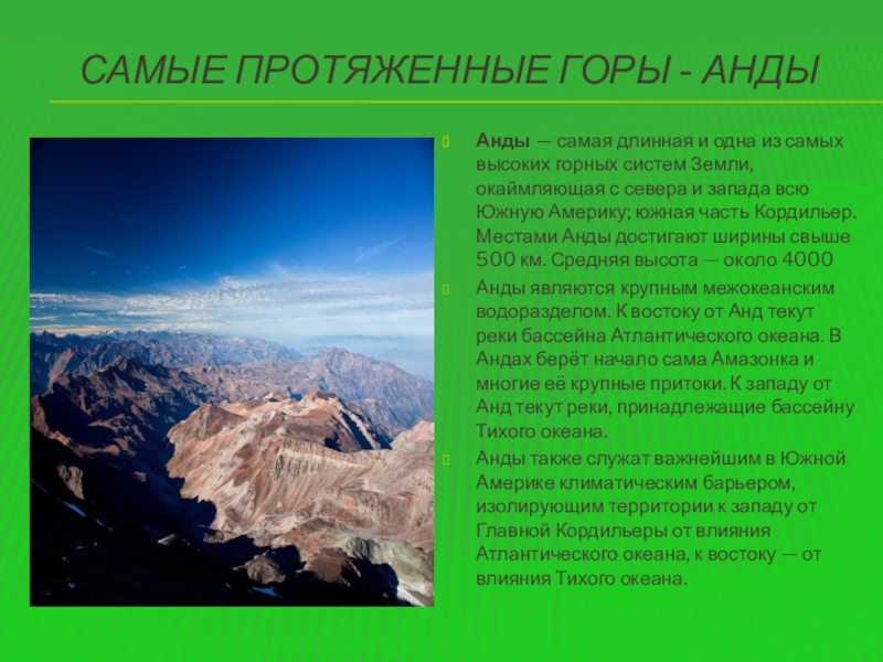 высоких горных систем Земли, окаймляющая с севера и запада всю Южную Америку; южная часть Кордильер. Местами Анды достигают ширины свыше 500 км. Средняя высота — около 4000