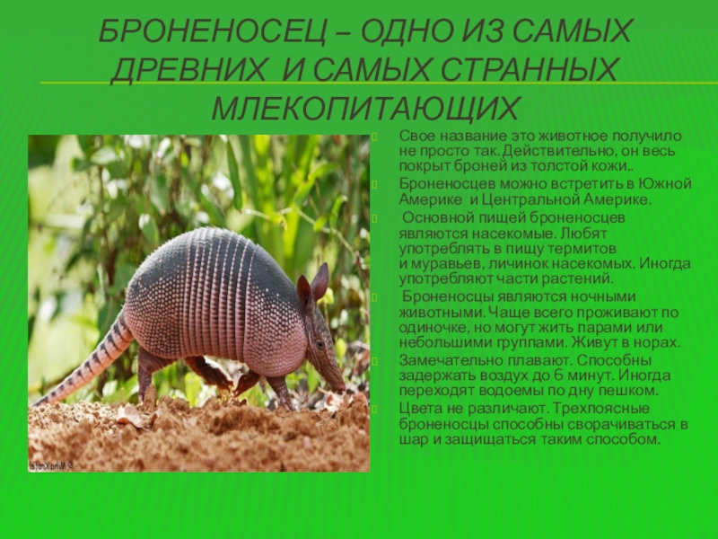 Слайд 12Броненосец – одно из самых древних и самых странных млекопитающих