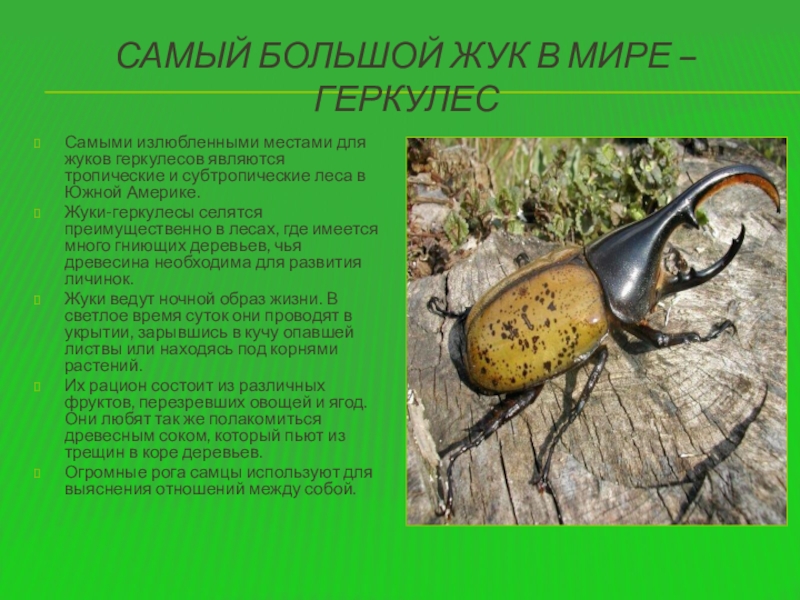 Жуки-геркулесы селятся преимущественно в лесах, где имеется много гниющих деревьев, чья древесина необходима для развития личинок.