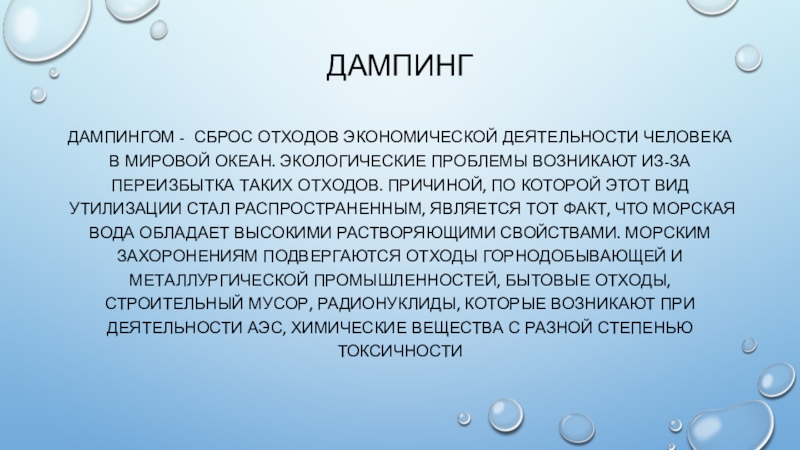 Дампингом - сброс отходов экономической деятельности человека в Мировой океан. Экологические