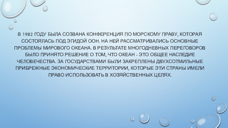 под эгидой ООН. На ней рассматривались основные проблемы Мирового океана. В результате многодневных переговоров было принято решение о том, что океан - это общее наследие человечества. За государствами были закреплены двухсотмильные прибрежные экономические территории, которые эти страны имели право использовать в хозяйственных целях.