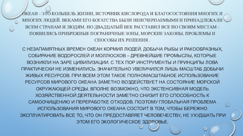 Экологические аспекты использования богатств океана Мировой океан — это гигантский генератор
