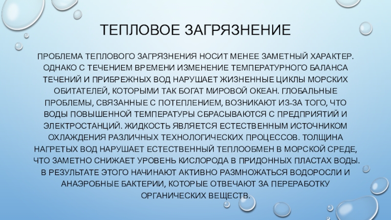 времени изменение температурного баланса течений и прибрежных вод нарушает жизненные циклы морских обитателей, которыми так богат Мировой океан. Глобальные проблемы, связанные с потеплением, возникают из-за того, что воды повышенной температуры сбрасываются с предприятий и электростанций. Жидкость является естественным источником охлаждения различных технологических процессов. Толщина нагретых вод нарушает естественный теплообмен в морской среде, что заметно снижает уровень кислорода в придонных пластах воды. В результате этого начинают активно размножаться водоросли и анаэробные бактерии, которые отвечают за переработку органических веществ.