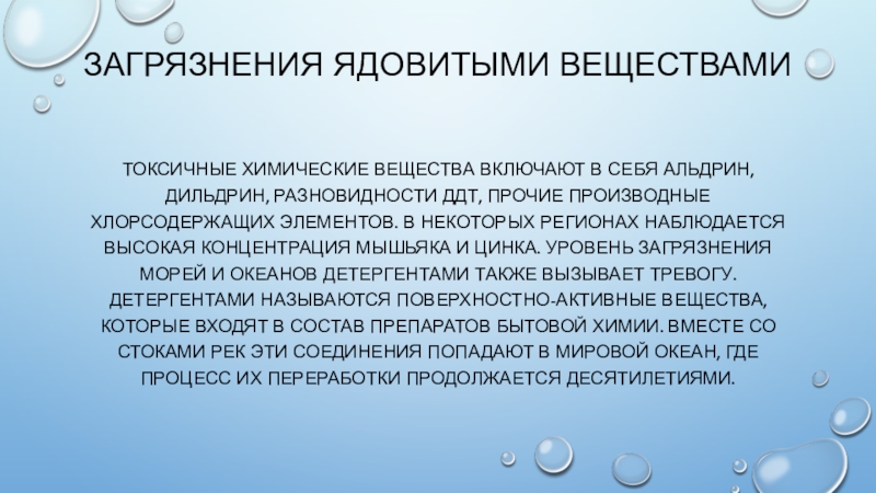 ДДТ, прочие производные хлорсодержащих элементов. В некоторых регионах наблюдается высокая концентрация мышьяка и цинка. Уровень загрязнения морей и океанов детергентами также вызывает тревогу. Детергентами называются поверхностно-активные вещества, которые входят в состав препаратов бытовой химии. Вместе со стоками рек эти соединения попадают в Мировой океан, где процесс их переработки продолжается десятилетиями.