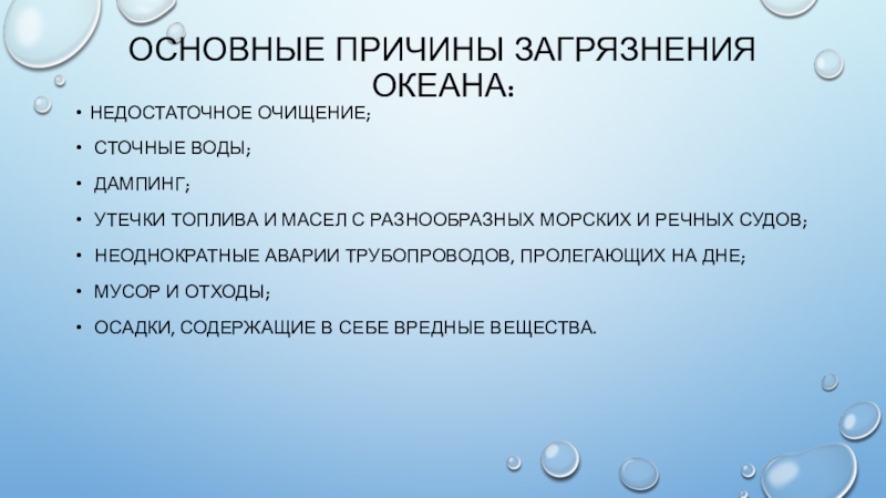 кислорода в природе. Основным производителем этого важнейшего для жизни химического элемента являются микроскопические сине-зеленые водоросли. Кроме этого, океан - мощнейший фильтр и ассенизатор, который перерабатывает и утилизирует продукты жизнедеятельности людей. Неспособность этого уникального природного механизма справиться с утилизацией отходов - настоящая экологическая проблема. Загрязнение Мирового океана происходит в подавляющем большинстве случаев по вине человека.