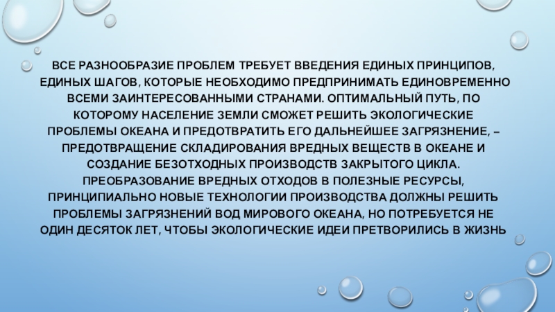 предпринимать единовременно всеми заинтересованными странами. Оптимальный путь, по которому население Земли сможет решить экологические проблемы океана и предотвратить его дальнейшее загрязнение, – предотвращение складирования вредных веществ в океане и создание безотходных производств закрытого цикла. Преобразование вредных отходов в полезные ресурсы, принципиально новые технологии производства должны решить проблемы загрязнений вод Мирового океана, но потребуется не один десяток лет, чтобы экологические идеи претворились в жизнь