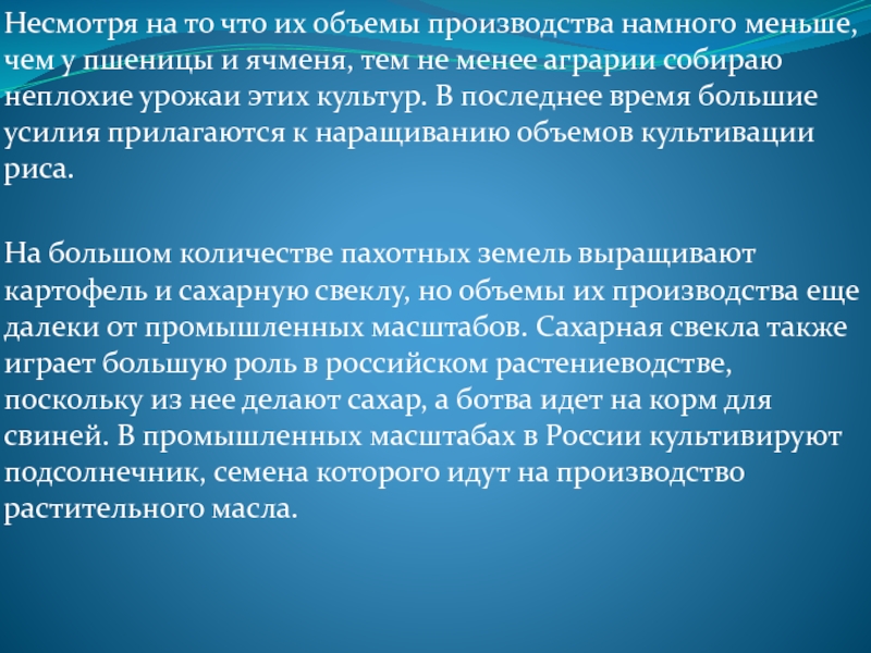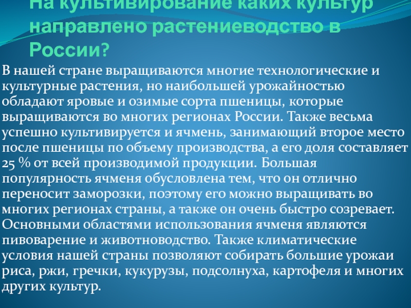 многие технологические и культурные растения, но наибольшей урожайностью обладают яровые и озимые сорта пшеницы, которые выращиваются во многих регионах России. Также весьма успешно культивируется и ячмень, занимающий второе место после пшеницы по объему производства, а его доля составляет 25 % от всей производимой продукции. Большая популярность ячменя обусловлена тем, что он отлично переносит заморозки, поэтому его можно выращивать во многих регионах страны, а также он очень быстро созревает. Основными областями использования ячменя являются пивоварение и животноводство. Также климатические условия нашей страны позволяют собирать большие урожаи риса, ржи, гречки, кукурузы, подсолнуха, картофеля и многих других культур.