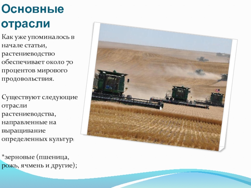 Существуют следующие отрасли растениеводства, направленные на выращивание определенных культур: