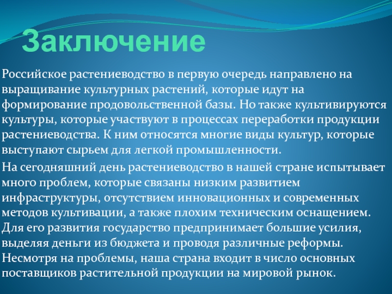 На сегодняшний день растениеводство в нашей стране испытывает много проблем, которые связаны низким развитием инфраструктуры, отсутствием инновационных и современных методов культивации, а также плохим техническим оснащением. Для его развития государство предпринимает большие усилия, выделяя деньги из бюджета и проводя различные реформы. Несмотря на проблемы, наша страна входит в число основных поставщиков растительной продукции на мировой рынок.