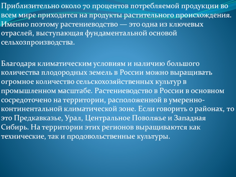 Благодаря климатическим условиям и наличию большого количества плодородных земель в России можно выращивать огромное количество сельскохозяйственных культур в промышленном масштабе. Растениеводство в России в основном сосредоточено на территории, расположенной в умеренно-континентальной климатической зоне. Если говорить о районах, то это Предкавказье, Урал, Центральное Поволжье и Западная Сибирь. На территории этих регионов выращиваются как технические, так и продовольственные культуры.