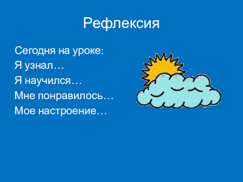 РефлексияСегодня на уроке:Я узнал…Я научился… Мне понравилось…Мое настроение…