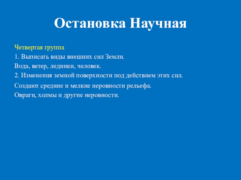 Остановка НаучнаяЧетвертая группа 1. Выписать виды внешних сил Земли.Вода, ветер, ледники, человек.2. Изменения земной поверхности под действием