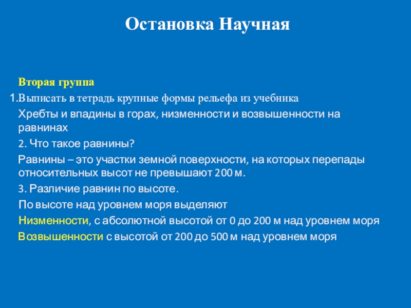Остановка Научная Вторая группа Выписать в тетрадь крупные формы рельефа из учебника Хребты и впадины в