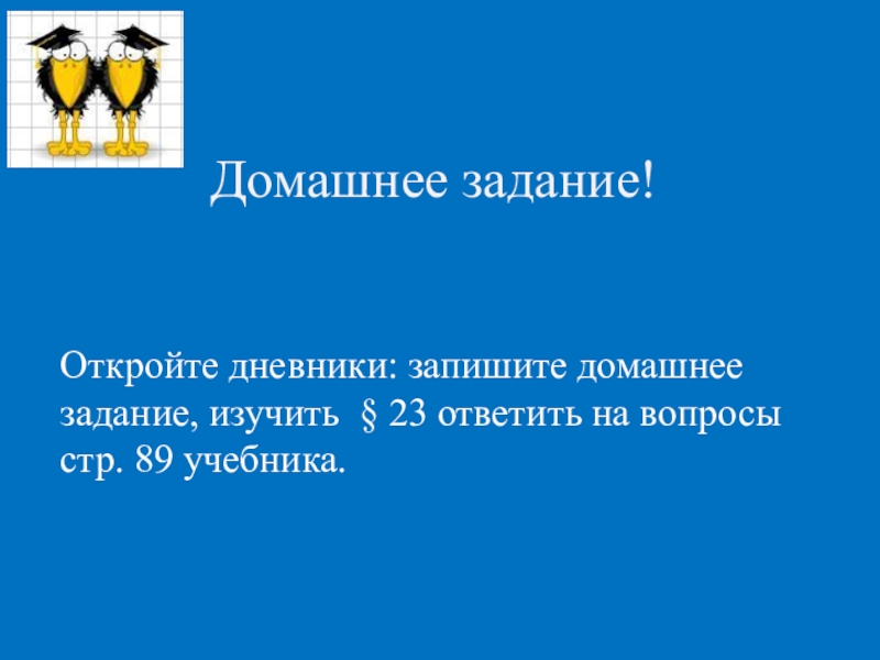 Домашнее задание!Откройте дневники: запишите домашнее задание, изучить § 23 ответить на вопросы стр. 89 учебника.