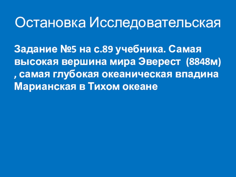 Остановка ИсследовательскаяЗадание №5 на с.89 учебника. Самая высокая вершина мира Эверест (8848м) , самая глубокая океаническая впадина