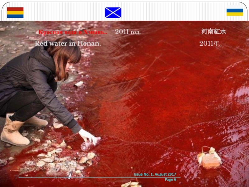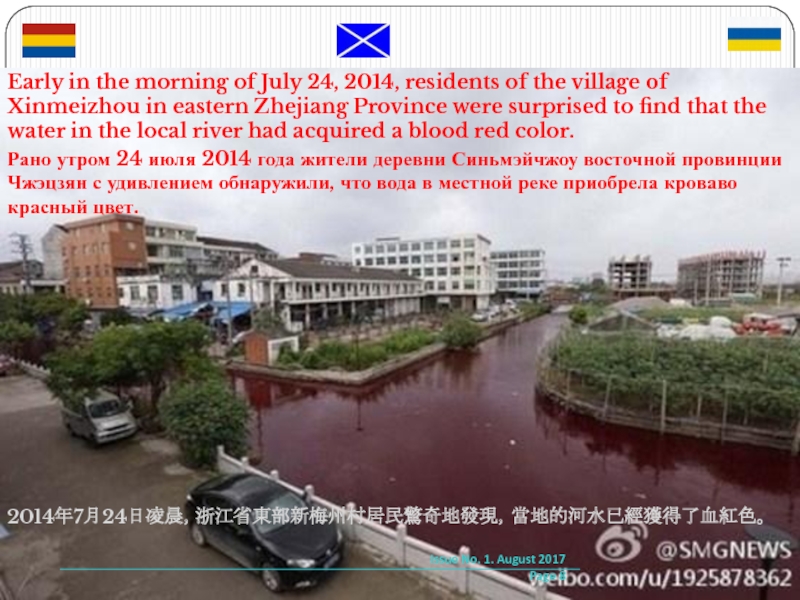 Рано утром 24 июля 2014 года жители деревни Синьмэйчжоу восточной провинции Чжэцзян с удивлением обнаружили, что вода в местной реке приобрела кроваво красный цвет.