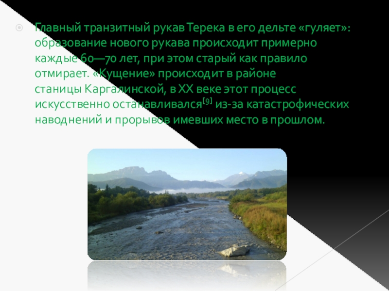 Слайд 3Главный транзитный рукав Терека в его дельте «гуляет»: образование нового рукава