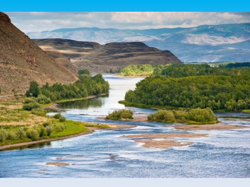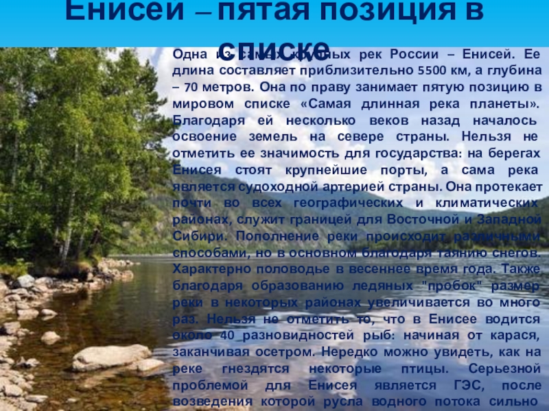 – Енисей. Ее длина составляет приблизительно 5500 км, а глубина – 70 метров. Она по праву занимает пятую позицию в мировом списке «Самая длинная река планеты». Благодаря ей несколько веков назад началось освоение земель на севере страны. Нельзя не отметить ее значимость для государства: на берегах Енисея стоят крупнейшие порты, а сама река является судоходной артерией страны. Она протекает почти во всех географических и климатических районах, служит границей для Восточной и Западной Сибири. Пополнение реки происходит различными способами, но в основном благодаря таянию снегов. Характерно половодье в весеннее время года. Также благодаря образованию ледяных "пробок" размер реки в некоторых районах увеличивается во много раз. Нельзя не отметить то, что в Енисее водится около 40 разновидностей рыб: начиная от карася, заканчивая осетром. Нередко можно увидеть, как на реке гнездятся некоторые птицы. Серьезной проблемой для Енисея является ГЭС, после возведения которой русла водного потока сильно уменьшились, вследствие чего появилась существенная угроза для флоры и фауны реки.