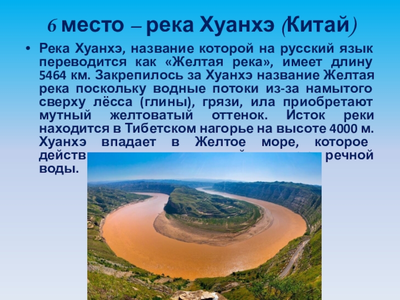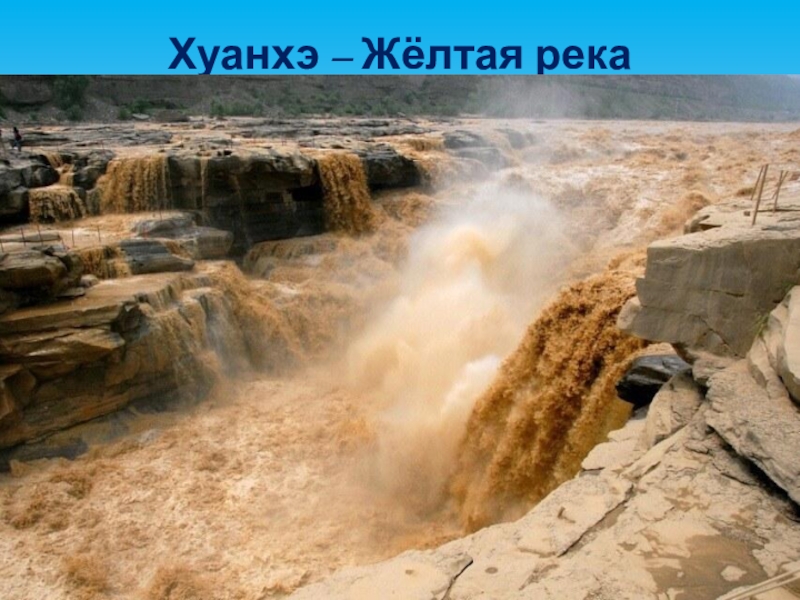 язык переводится как «Желтая река», имеет длину 5464 км. Закрепилось за Хуанхэ название Желтая река поскольку водные потоки из-за намытого сверху лёсса (глины), грязи, ила приобретают мутный желтоватый оттенок. Исток реки находится в Тибетском нагорье на высоте 4000 м. Хуанхэ впадает в Желтое море, которое действительно имеет желтый цвет из-за речной воды.