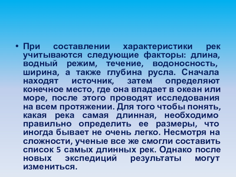 водоносность, ширина, а также глубина русла. Сначала находят источник, затем определяют конечное место, где она впадает в океан или море, после этого проводят исследования на всем протяжении. Для того чтобы понять, какая река самая длинная, необходимо правильно определить ее размеры, что иногда бывает не очень легко. Несмотря на сложности, ученые все же смогли составить список 5 самых длинных рек. Однако после новых экспедиций результаты могут измениться.