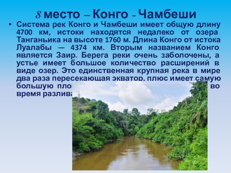 общую длину 4700 км, истоки находятся недалеко от озера Танганьика на высоте 1760 м. Длина Конго от истока Луалабы — 4374 км. Вторым названием Конго является Заир. Берега реки очень заболочены, а устье имеет большое количество расширений в виде озер. Это единственная крупная река в мире два раза пересекающая экватор, плюс имеет самую большую площадь в мире затопляемой земли во время разлива.