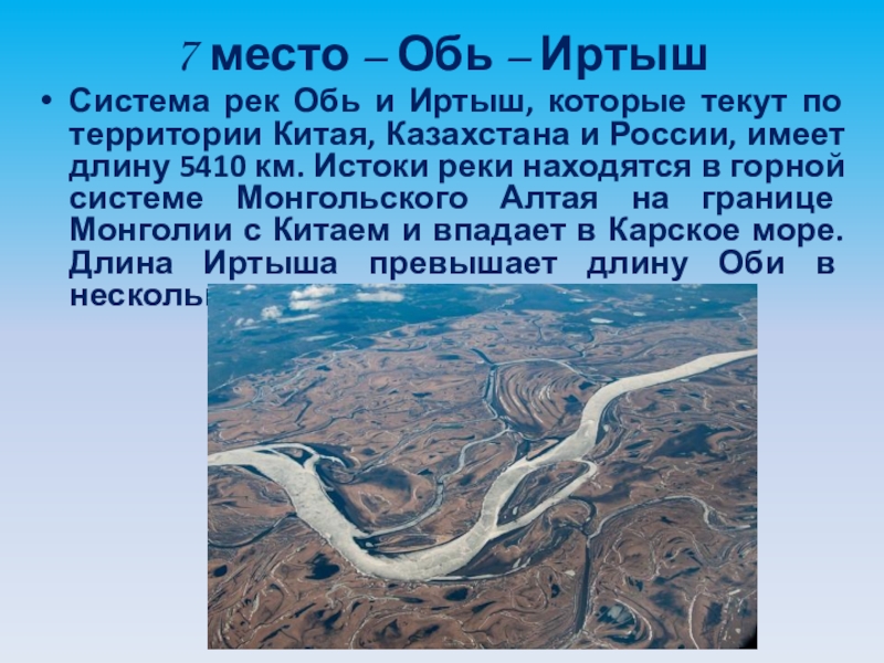 которые текут по территории Китая, Казахстана и России, имеет длину 5410 км. Истоки реки находятся в горной системе Монгольского Алтая на границе Монголии с Китаем и впадает в Карское море. Длина Иртыша превышает длину Оби в несколько раз и составляет 4248 км.