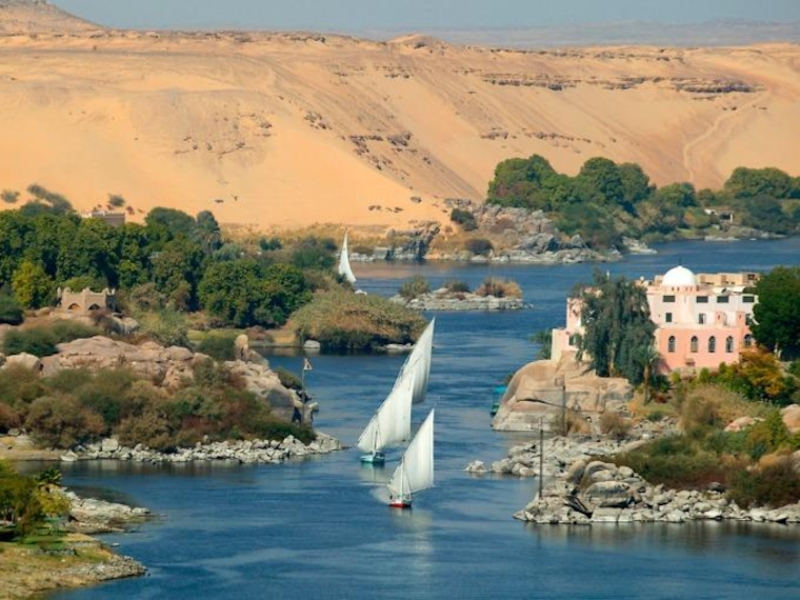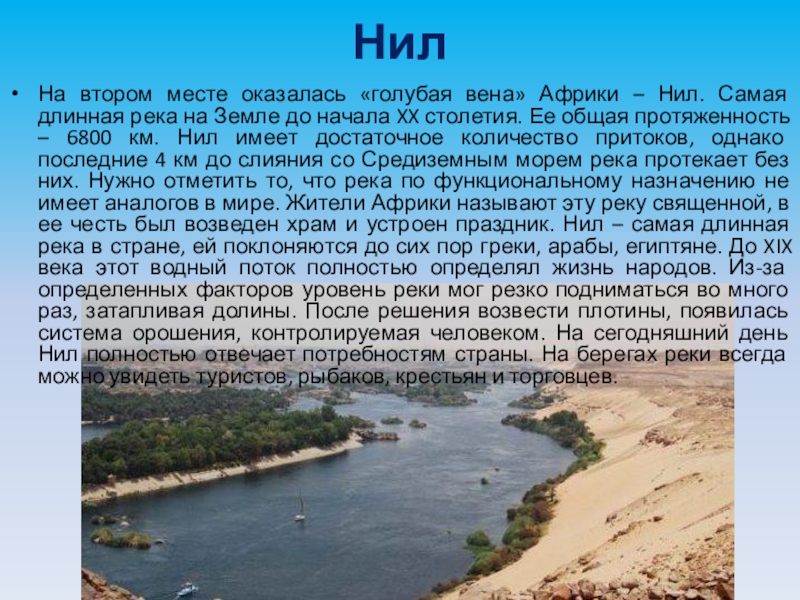 река на Земле до начала XX столетия. Ее общая протяженность – 6800 км. Нил имеет достаточное количество притоков, однако последние 4 км до слияния со Средиземным морем река протекает без них. Нужно отметить то, что река по функциональному назначению не имеет аналогов в мире. Жители Африки называют эту реку священной, в ее честь был возведен храм и устроен праздник. Нил – самая длинная река в стране, ей поклоняются до сих пор греки, арабы, египтяне. До XIX века этот водный поток полностью определял жизнь народов. Из-за определенных факторов уровень реки мог резко подниматься во много раз, затапливая долины. После решения возвести плотины, появилась система орошения, контролируемая человеком. На сегодняшний день Нил полностью отвечает потребностям страны. На берегах реки всегда можно увидеть туристов, рыбаков, крестьян и торговцев.