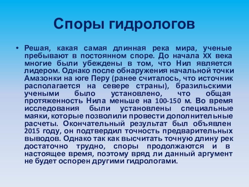 постоянном споре. До начала XX века многие были убеждены в том, что Нил является лидером. Однако после обнаружения начальной точки Амазонки на юге Перу (ранее считалось, что источник располагается на севере страны), бразильскими учеными было установлено, что общая протяженность Нила меньше на 100-150 м. Во время исследования были установлены специальные маяки, которые позволили провести дополнительные расчеты. Окончательный результат был объявлен 2015 году, он подтвердил точность предварительных выводов. Однако так как высчитать точную длину рек достаточно трудно, споры продолжаются и в настоящее время, поэтому вряд ли данный аргумент не будет оспорен другими гидрологами.