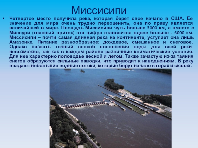 Ее значение для мира очень трудно переоценить, она по праву является величайшей в мире. Площадь Миссисипи чуть больше 3000 км, а вместе с Миссури (главный приток) эта цифра становится вдвое больше - 6000 км. Миссисипи – почти самая длинная река на континенте, уступает она лишь Амазонке. Питание разнообразное: дождевое, смешанное и снеговое. Однако назвать точный способ пополнения воды для всей реки невозможно, так как в каждом районе различные климатические условия. Для нее характерно половодье весной и летом. Также зачастую из-за таяния снегов образуются сильные паводки, что приводит к наводнениям. В реку впадают небольшие водные потоки, которые берут начало в горах и скалах.