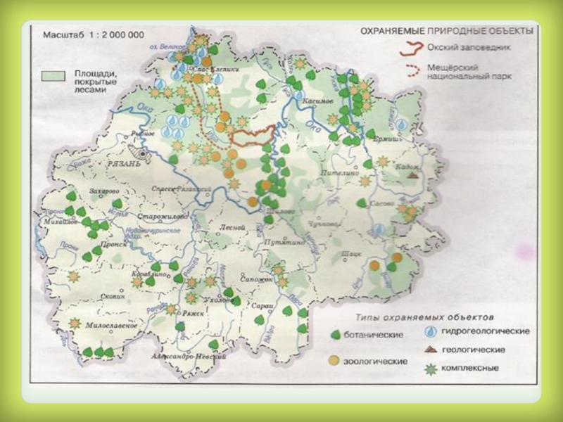 территорий, в том числе: Мещёрский национальный парк, Окский заповедник, 47 заказников, 57 памятников природы.