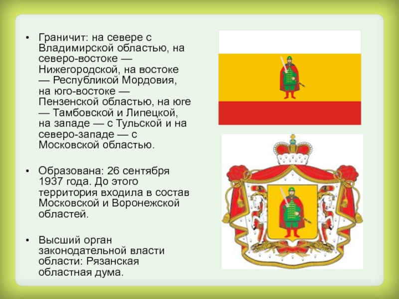 Высший орган законодательной власти области: Рязанская областная дума.