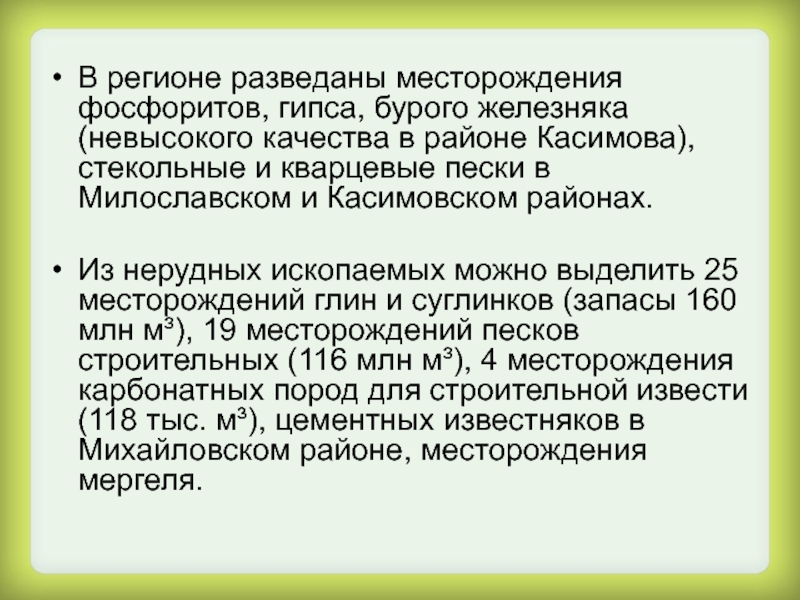 районе Касимова), стекольные и кварцевые пески в Милославском и Касимовском районах.
