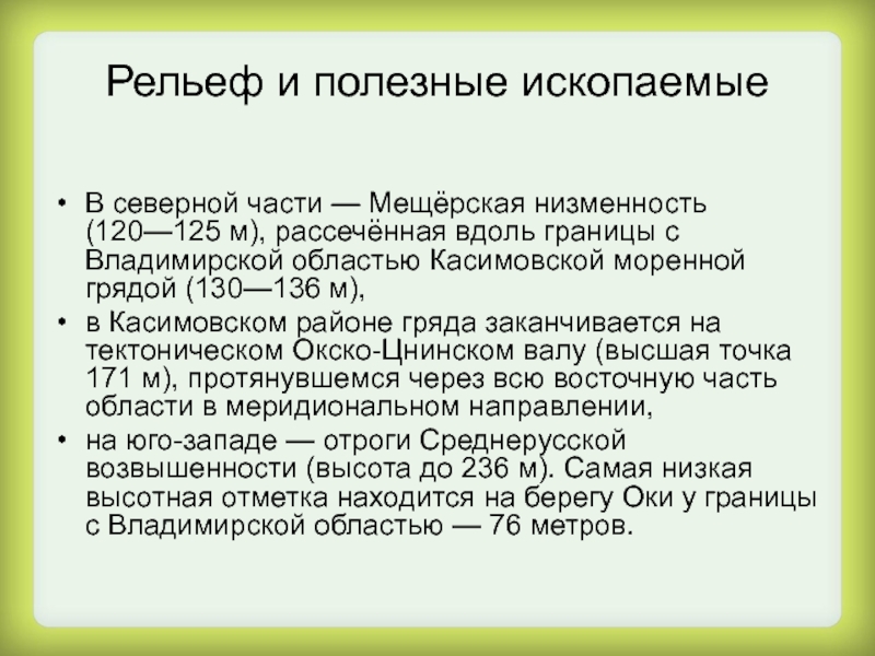 в Касимовском районе гряда заканчивается на тектоническом Окско-Цнинском валу (высшая точка 171 м), протянувшемся через всю восточную часть области в меридиональном направлении,