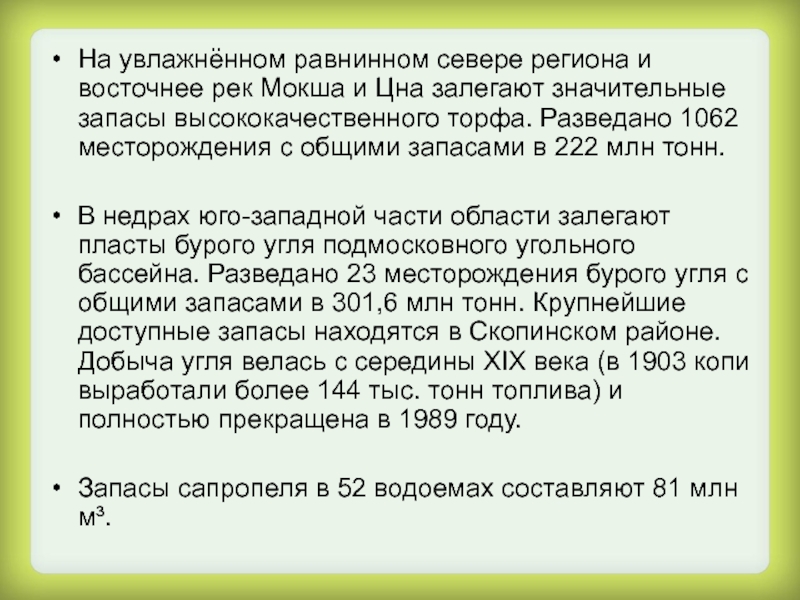 залегают значительные запасы высококачественного торфa. Разведано 1062 месторождения с общими запасами в 222 млн тонн.