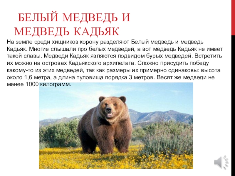 Белый медведь и медведь Кадьяк. Многие слышали про белых медведей, а вот медведь Кадьяк не имеет такой славы. Медведи Кадьяк являются подвидом бурых медведей. Встретить их можно на островах Кадьякского архипелага. Сложно присудить победу какому-то из этих медведей, так как размеры их примерно одинаковы: высота около 1,6 метра, а длина туловища порядка 3 метров. Весят же медведи не менее 1000 килограмм.