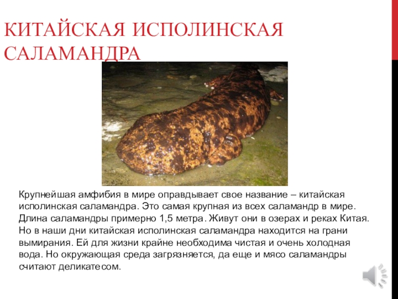исполинская саламандра. Это самая крупная из всех саламандр в мире. Длина саламандры примерно 1,5 метра. Живут они в озерах и реках Китая. Но в наши дни китайская исполинская саламандра находится на грани вымирания. Ей для жизни крайне необходима чистая и очень холодная вода. Но окружающая среда загрязняется, да еще и мясо саламандры считают деликатесом.
