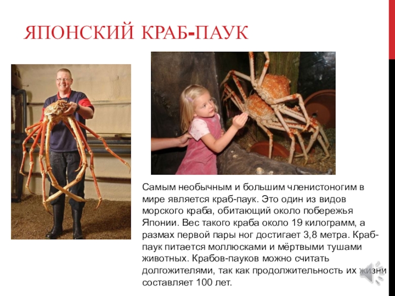 один из видов морского краба, обитающий около побережья Японии. Вес такого краба около 19 килограмм, а размах первой пары ног достигает 3,8 метра. Краб-паук питается моллюсками и мёртвыми тушами животных. Крабов-пауков можно считать долгожителями, так как продолжительность их жизни составляет 100 лет.