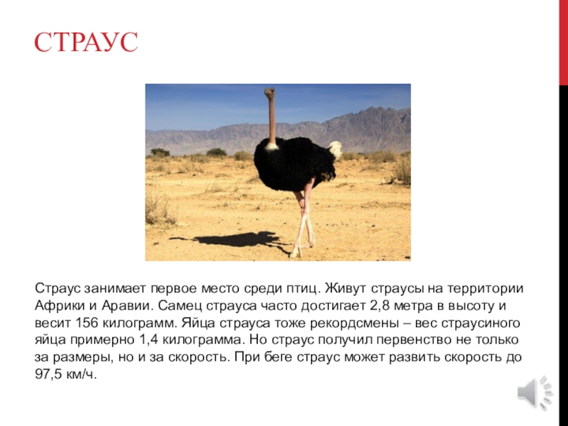 и Аравии. Самец страуса часто достигает 2,8 метра в высоту и весит 156 килограмм. Яйца страуса тоже рекордсмены – вес страусиного яйца примерно 1,4 килограмма. Но страус получил первенство не только за размеры, но и за скорость. При беге страус может развить скорость до 97,5 км/ч.