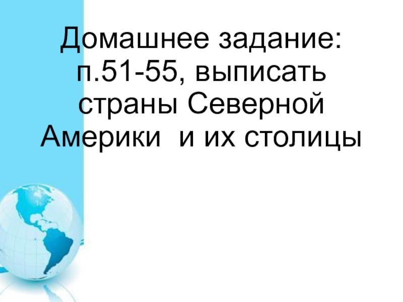 Слайд 17Домашнее задание: п.51-55, выписать страны Северной Америки и их столицы
