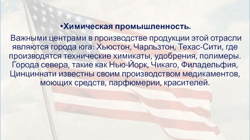 юга: Хьюстон, Чарльзтон, Техас-Сити, где производятся технические химикаты, удобрения, полимеры. Города севера, такие как Нью-Йорк, Чикаго, Филадельфия, Цинциннати известны своим производством медикаментов, моющих средств, парфюмерии, красителей.