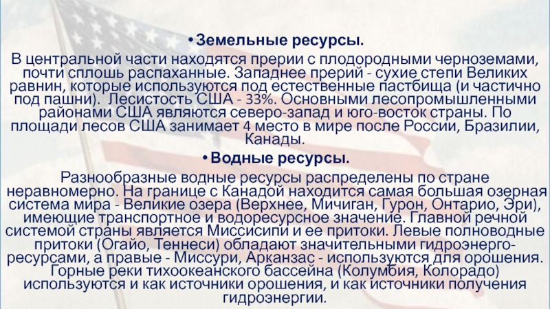 Разнообразные водные ресурсы распределены по стране неравномерно. На границе с Канадой находится самая большая озерная система мира - Великие озера (Верхнее, Мичиган, Гурон, Онтарио, Эри), имеющие транспортное и водоресурсное значение. Главной речной системой страны является Миссисипи и ее притоки. Левые полноводные притоки (Огайо, Теннеси) обладают значительными гидроэнерго-ресурсами, а правые - Миссури, Арканзас - используются для орошения. Горные реки тихоокеанского бассейна (Колумбия, Колорадо) используются и как источники орошения, и как источники получения гидроэнергии.
